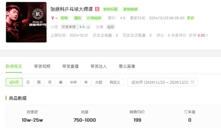 此前的报道还提到,张继科曾开卖“乒乓球大师课”。这门199元的录播课程在上线万元的销售额。