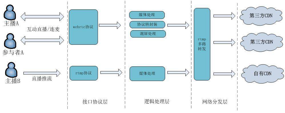 互动直播:(连麦,二对多/多对多,私有协议+标准协议,DC/OC+CDN)