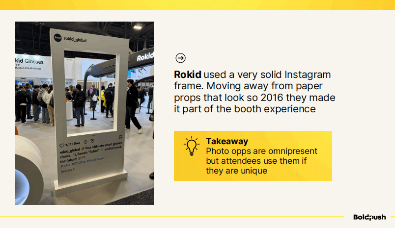 Rokid则在拍照打卡点的设计上做出了突破。他们摒弃了那种看起来像2016年产物的纸质道具相框,而是制作了一个精致的实体Instagram相框,成为展位体验的有机组成部分。