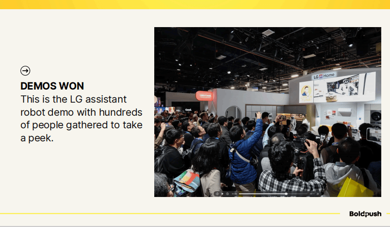 LG的机器人助手演示就是一个绝佳案例。他们的AI家庭助手机器人在展区中央进行现场演示,数百人围观,纷纷举起手机拍摄。这个画面本身就说明了演示的力量。