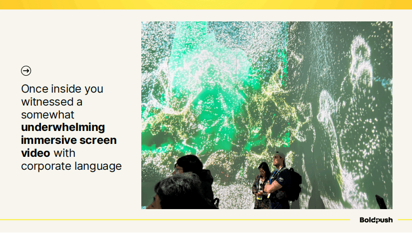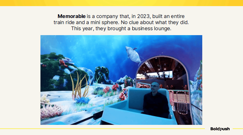 Memorable是另一个值得深思的案例。这家公司在2023年CES上搭建了一个完整的火车体验和迷你球形屏幕,但我完全不知道他们是做什么的。今年,他们带来的是一个商务休息区,有沉浸式的水下场景投影。设计很酷,但核心问题依然存在:他们到底是做什么的?