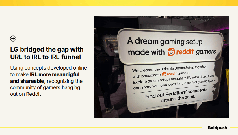 LG在这方面做得更加出色。他们打造了URL to IRL to URL的闭环营销漏斗。他们与Reddit合作,展示了一个由Reddit游戏玩家社区共同设计的梦想游戏设置。展台上的标识写着:与Reddit游戏玩家一起打造的梦想游戏设置,并且在整个展区内展示了Redditors的评论。