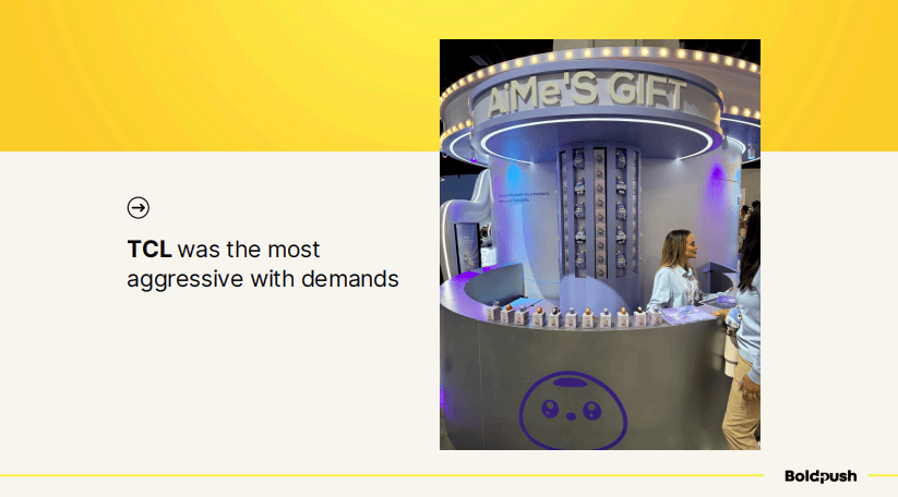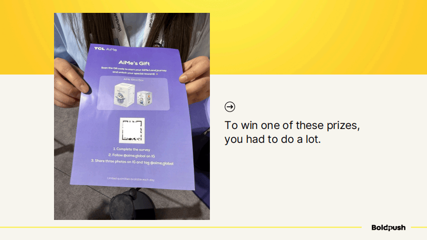 TCL在要求用户行动方面最为激进。他们设置了AiMes Gift展台,要获得礼品,你需要:完成问卷、关注Instagram账号、发布三张照片并标记账号。这个门槛不低,但礼品足够有吸引力,所以人们愿意去做。