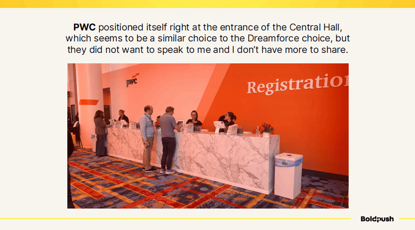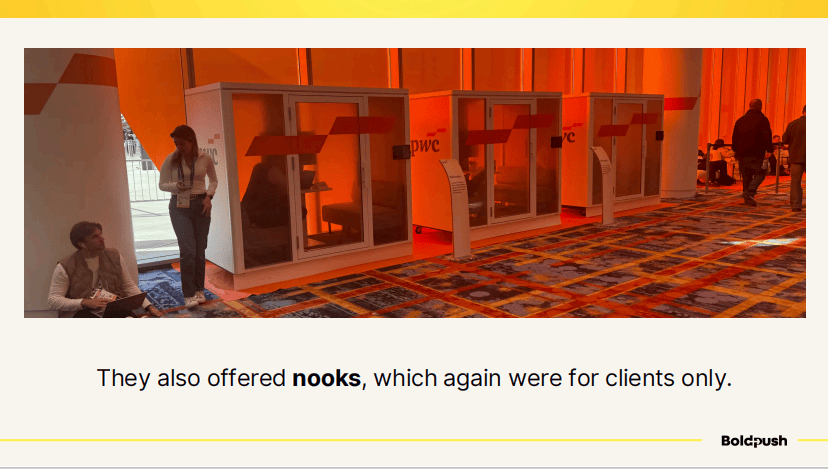 普华永道则在中央大厅入口处设置了休息区,这似乎与他们在Dreamforce的选址策略类似——选择人流必经之处。他们还提供了私密的小隔间(nooks),供客户进行一对一会谈。
