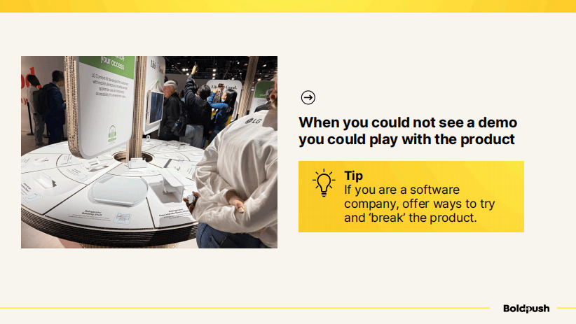 即使无法提供专人演示,也要让产品可以被触摸和体验。我看到LG设置了一个开放式的产品体验区,观众可以自由尝试各种产品配件。我的建议是:如果你是软件公司,不妨提供让用户尝试打破产品的机会。这种互动方式比单纯的观看更有参与感。
