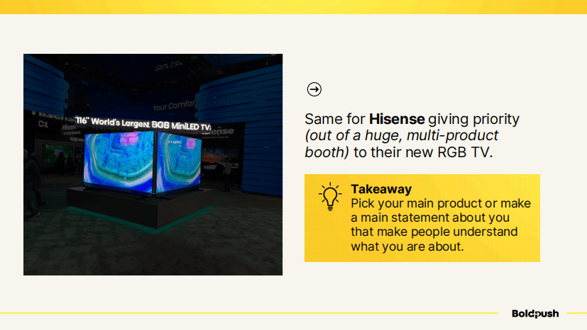 海信同样聪明。尽管他们的展区面积巨大、产品线丰富,但他们选择将新款RGB电视放在最显眼的位置,作为主打产品优先展示。