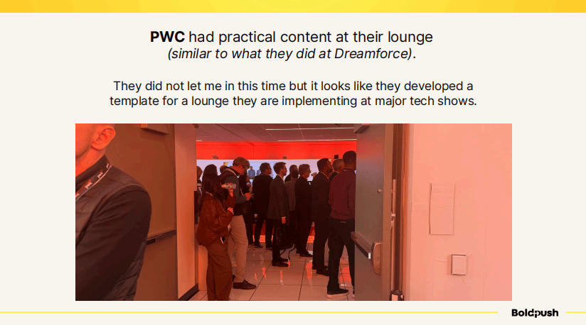 普华永道(PWC)在这方面做得更好。他们在休息区内提供了实用性内容,这与他们在Dreamforce大会上的做法类似。看起来他们已经开发出一套可以在各大科技展会复用的休息区模板。