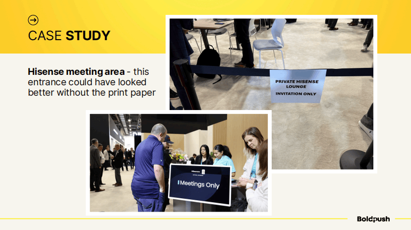 海信设置了专门的会议区域,入口处有工作人员核实预约。不过,他们的标识是打印纸张,与整体展位的高端感不太匹配——这再次说明细节的重要性。