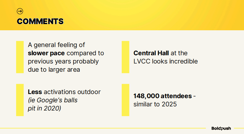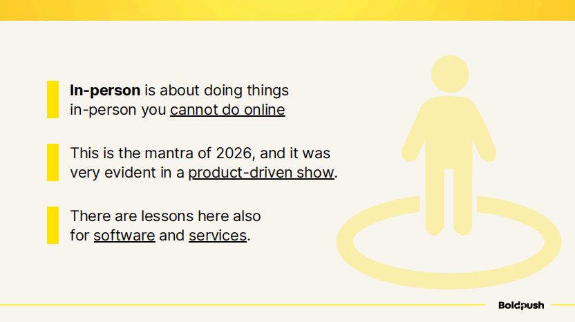 这个道理其实很简单:线下活动的价值在于提供线上无法实现的体验。这是2026年的核心理念,在这个产品驱动的展会上体现得淋漓尽致。即便是软件和服务类企业,也能从中汲取经验。
