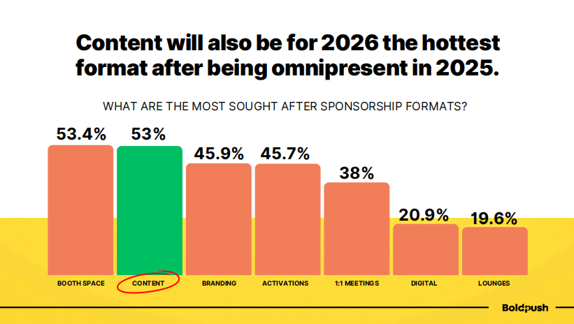 根据行业调研数据,在最受欢迎的赞助形式中,内容以53%的占比与展位空间并列第一,领先于品牌露出(45.9%)、激活活动(45.7%)、一对一会议(38%)、数字化手段(20.9%)和休息区(19.6%)。