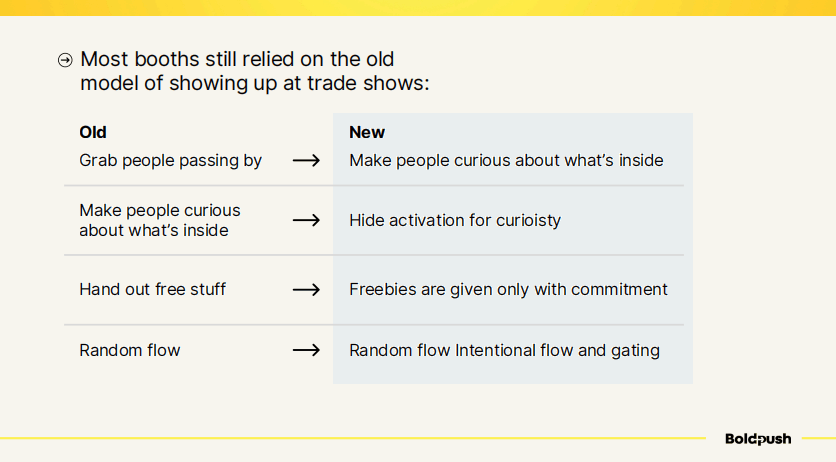 我观察到展会营销正在经历一个范式转变。大多数展位仍然沿用传统的参展模式,但前沿的展商已经开始采用全新的方法: