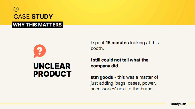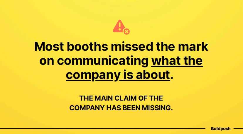 令我惊讶的是,大多数展位在传达公司是做什么的这一基本问题上都做得不够好。主要信息缺失是一个普遍问题。