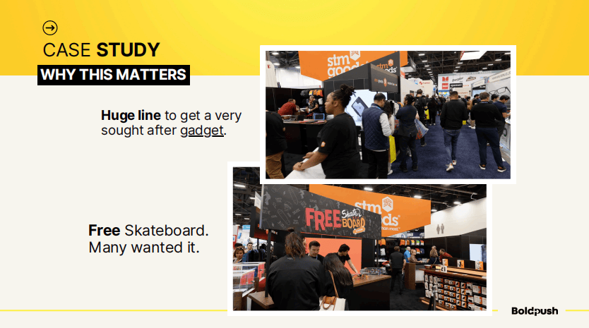 我花了大约15分钟观察一个展位——STM Goods。他们有一个非常吸引人的激活活动——免费送滑板,排队的人很多。但问题是,即使在观察了这么长时间之后,我仍然不知道这家公司是做什么的。