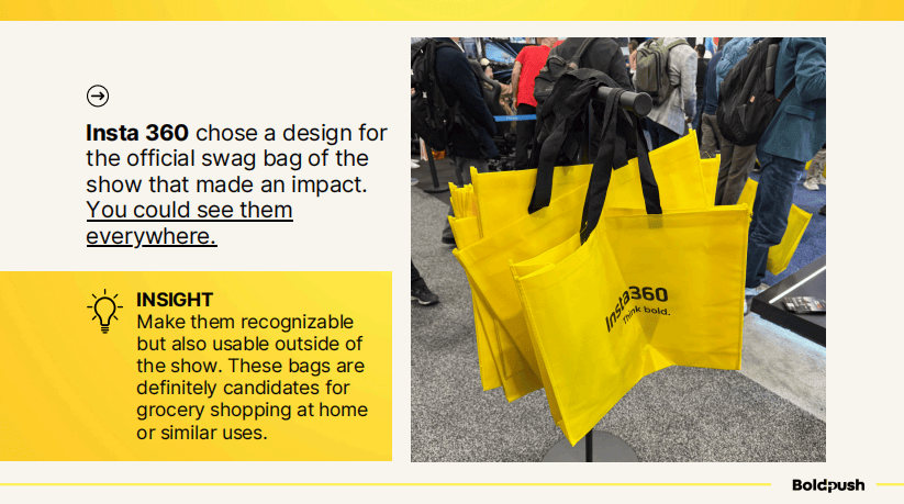 Insta360在这方面给出了一个优秀示范。他们设计了本届展会的官方手提袋,鲜艳的黄色配上清晰的品牌标识,在展馆里随处可见。更重要的是,这个袋子设计得实用美观,参会者回家后完全可以用来购物——这意味着品牌曝光会延续到展会之后。