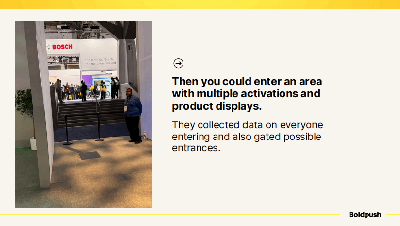 博世(Bosch)同样采用了门控策略。他们在入口处收集每位进入者的信息,同时封堵了其他可能的入口。通过这种方式,他们确保每一位进入展区的人都已经被纳入了销售线索数据库。