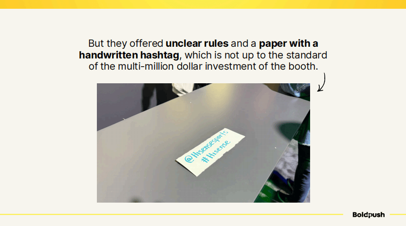 然而,执行细节让我有些失望。他们提供的活动规则不够清晰,最离谱的是——用来展示分享标签的居然是一张手写的纸条!这与他们数百万美元级别的展位投资完全不匹配。