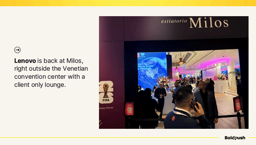 联想(Lenovo)连续多年在威尼斯人酒店旁边的Milos高端餐厅设置客户专属休息区,位置就在会展中心外面,非常方便。