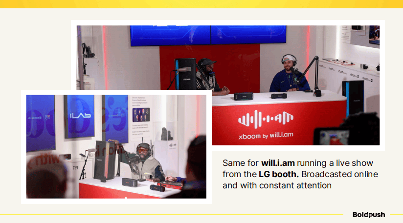 LG邀请了will.i.am在展位上进行现场直播节目,既有线下围观者,又同步在线上传播,实现了双重曝光效果。
