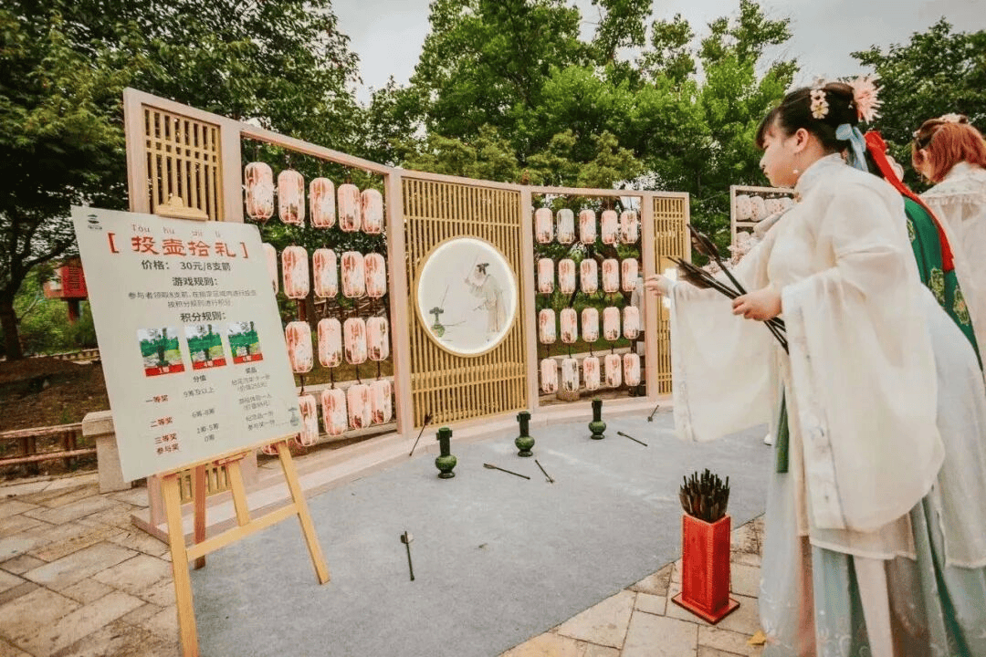 4.“趣味迎春”青春游园区。沿街设置多个传统民俗游戏点位,如:“投壶纳福”、“趣味蹴鞠”、“新春灯谜”、“马年滚滚乐”、“蒙眼敲锣”等。参与者需支付一张2元“游园通宝券”参与游戏,通过游戏可获得不同面值的“游园通宝券”。