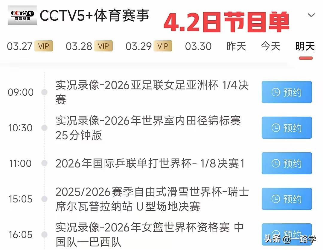 直播方面,电视看CCTV5和CCTV5 ,上午场看5 ,晚上黄金时间看5。网络上央视频、咪咕、腾讯体育都能看,全程直播,球迷不用愁看不到。
