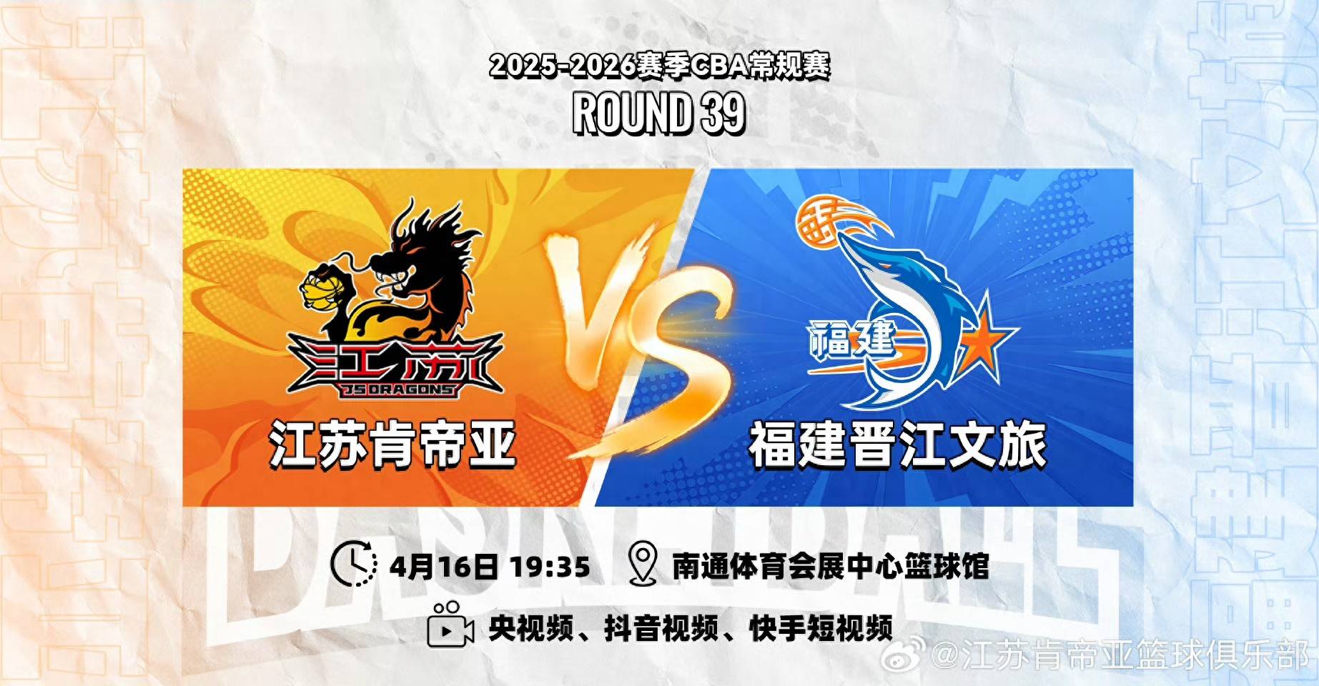 2026-04-19斗鱼,斗鱼直播,斗鱼APP,游戏直播,电竞直播,手游直播,lol直播,英雄联盟直播,dnf直播,cf直播,绝地求生直播,王者荣耀直播,二次元直播,英雄联盟,绝地求生,和平精英,魔兽世界,三角洲4月16日,CBA常规赛有一场江苏男篮主场对福建男篮的比赛。在积分榜上,江苏队目前的战绩是10胜28负,排在第19位。福建队的战绩是14胜24负,排在第18位。两队都已经提前无缘季后赛了,所以这场比赛更多的是为荣誉而战。